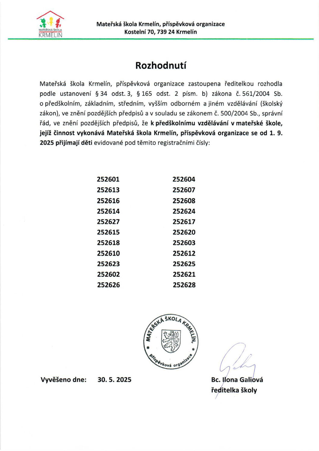 Zápis do mateřské školy na školní rok 2026/2027 bude v období od 15. března do 15. dubna. Přesný termín určí ředitelka mateřské školy.
